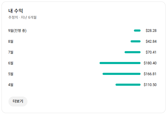 이 채널은 9월달 수익이 28.28달러 (한화로 약 3만 9천원) 발생했습니다. 9월 안에 애드센스를 변경하시면, 다음 달에 이 수익을 지급받으시게 됩니다.